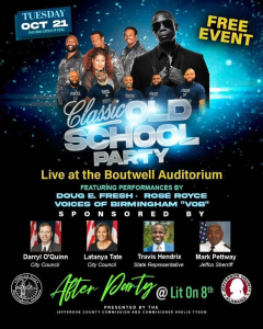 Get ready to groove at the Magic City Classic Old School Party with Doug E. Fresh, Rose Royce, and VOB (Voices of Birmingham) Live! It will be a night of dancing and singing along to your favorite hits from back in the day. This event will transport you back in time with legendary artists and unforgettable music. Don’t miss out on this FREE concert experience presented by Commissioner Sheila Tyson and District 2!