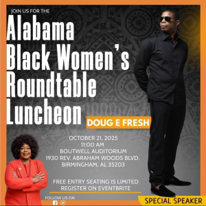Join us for the annual Alabama Black Women’s Roundtable Luncheon. This years special guest is Doug E. Fresh. This is a free event but a ticket is needed. Seating is limited. Grab your ticket today!