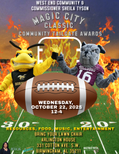 The West End Community and Commissioner Sheila Tyson presents Magic City Classic Community Tailgate Awards. This is a free event! There will be resources, food, music, entertainment, and more! Just bring your lawn chair have a great time!